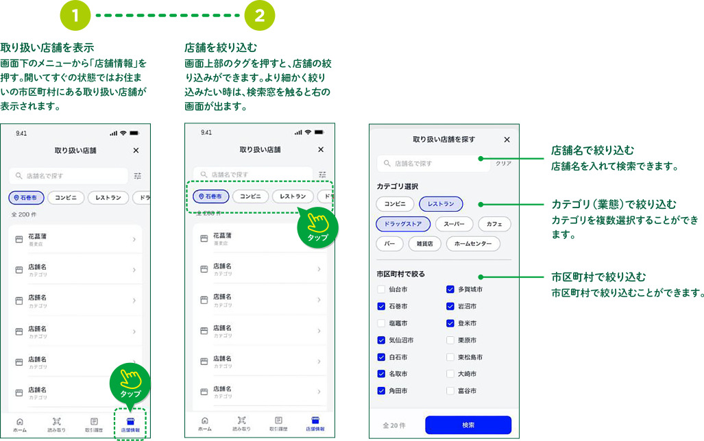 みやぎポイントミニアプリから利用可能店舗を探せます。